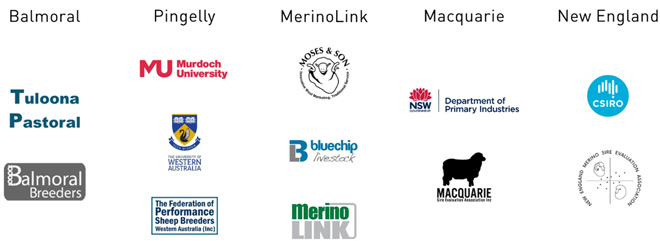 - Sires with ASBVs were drawn from across four main MERINOSELECT genetic groups, with an additional group outside these categories. They were chosen in proportion to their frequency in the national flock to ensure the project reflected the diversity of Merino breeding so that the MLP outcomes were representative of the breadth of genetics available to Australian Merino breeders. The groups were: