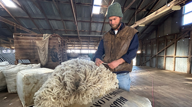 Tom Sutherland with the clip at ‘Budgalong’ near Wellington, NSW, where the Sutherland family runs about 6,600 joined ewes plus ewe lambs, with 3,500 Merinos joined to Merinos.