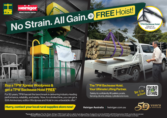 To mark this milestone, Heiniger is offering a limited-time promotion: with every TPW Xpress Woolpress purchased, customers will receive a free TPW Backease 600 Hoist – a gesture that celebrates the company’s legacy while equipping sheds for the future.