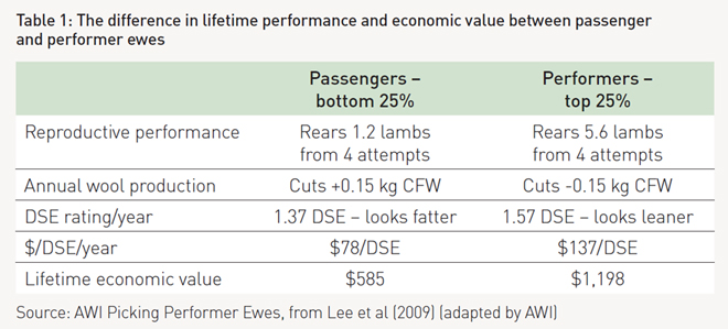 Ewes can differ massively in their reproductive performance, and the difference between economic value of passengers vs. performers is substantial over their lifetime. Notably, their dry sheep equivalent (DSE) rating and wool production is only marginally different.