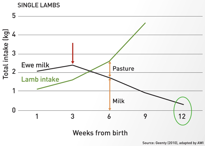 Did you know a ewe reaches the peak of her lactation about 20–30 days after she lambs? Yet the lamb’s requirements continue to increase well beyond what she’s capable of providing. By 12–14 weeks after lambing, the ewe is providing a very small proportion of the nutritional requirements of the lamb (Figure 1).