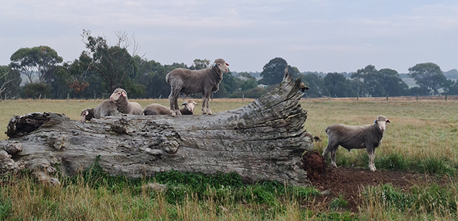 Ram lambs from Connewarran Merino Stud at Mortlake in Victoria's Southwest take a moment to survey their surrounds, which they share with a flourishing abundance of wildlife. Connewarran is a thriving Merino wool-growing property built by Richard and Jenny Weatherly and now the next generation, Hamish and Eli Weatherly, on respect for the land and its natural inhabitants.