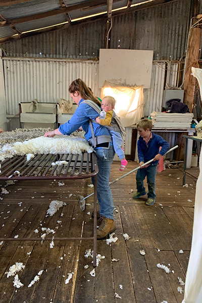 Jaz Hobbs of Bendemeer in the New England region of NSW wool classing in her shed last year, with daughter Reigny on her back and son Archie “helping out”. Jazmine says, “I’m glad I have images like this to share what it looks like to raise children while being responsible for animals and a business, and showcase what many women do every day in rural Australia.” Thanks for tagging this and other photos #beyondthebale on Instagram, @jazhobbs.