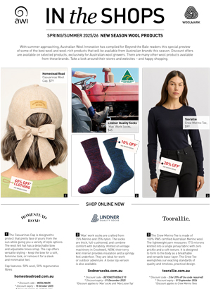 AWI has compiled this special preview of some wool products that will be available from Australian brands this season. Discount offers are available on selected products, exclusively for Australian woolgrowers. There are many other wool products available from these brands. Take a look around their stores and websites – and happy shopping...