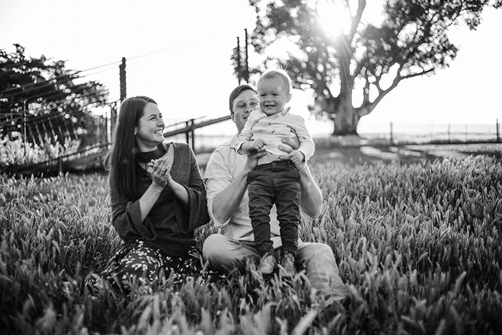 Emily Riggs (wearing the iris + wool Eurovale top) after returning home to the farm at Burra after participating in the #buyfromthebush pop-up market in Sydney, pictured here with her woolgrower husband and son Sam.